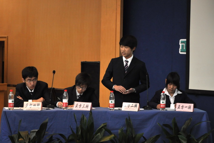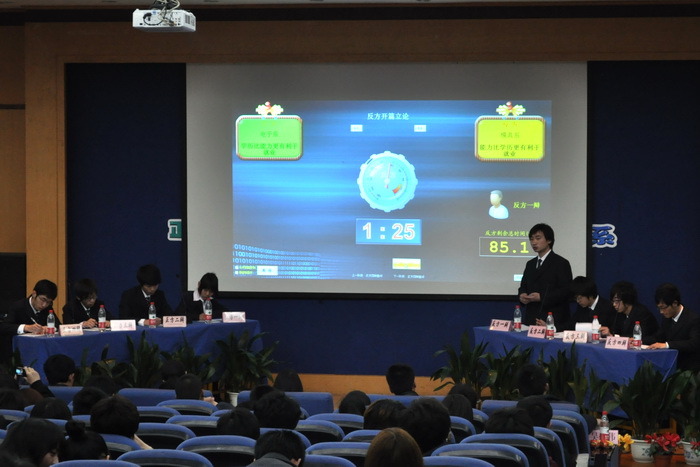 來自各系共八支代表隊參加了我院2011年“建軍杯”辯論賽,他們積極參與,充分準備,為我們奉獻了一場又一場精彩絕倫的比賽。總決賽上,電子系代表隊和模具系代表隊圍繞“學歷還是能力讓大學生更利于就業”這一辯題展開辯論。在歷時一個多小時的激辯交鋒中,雙方辯手都圍繞著本方觀點,拿出古今中外的典型例子,在申明自己立場的同時,也頻頻發問把對方的觀點推倒。這場唇槍舌戰自然贏得了臺下觀眾陣陣熱烈的掌聲。