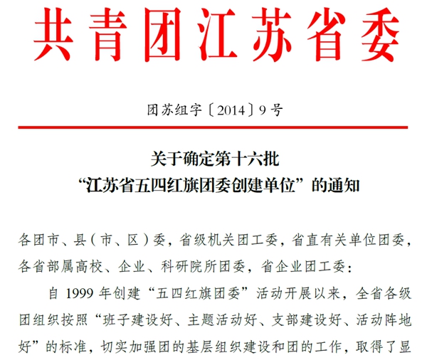“江蘇省五四紅旗團委”是江蘇團省委授予基層團委的綜合性最高榮譽。 “江蘇省五四紅旗團委”創建活動始于1999年,旨在把共青團工作的“橋頭堡”向基層一線延伸,提升基層團組織工作活力,是新形勢下全面推進團的基層組織建設、活躍基層團的工作的重要載體和有形手段。
