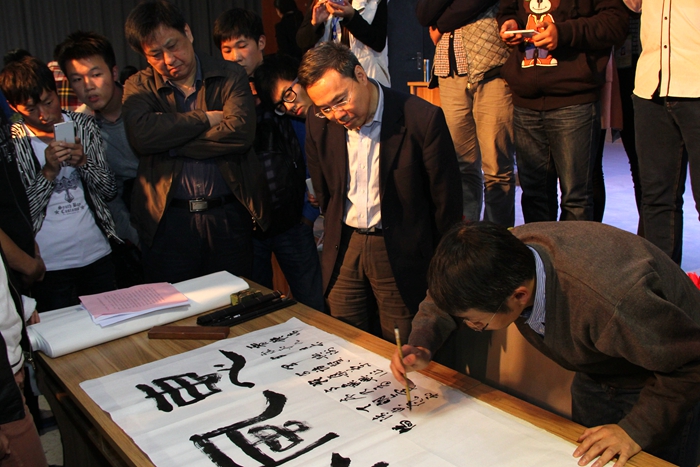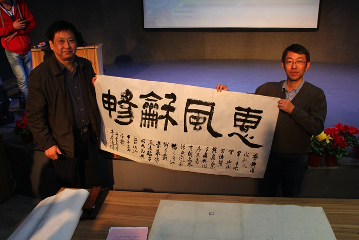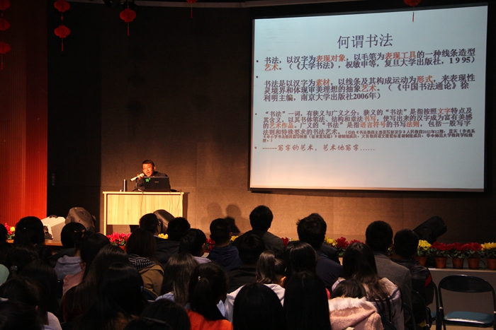 講座圖文并茂,深入淺出,氣氛活潑,能容近300人的小會場座無虛席,掌聲雷動,聽者受益匪淺。吳勇先生還與學生進行了互動:對學生的提問一一作答,并為學生的書法作品進行了點評。最后,吳勇先生即興揮毫作書,為師生近距離領略翰墨風采,吳勇當場贈送個人書法作品。