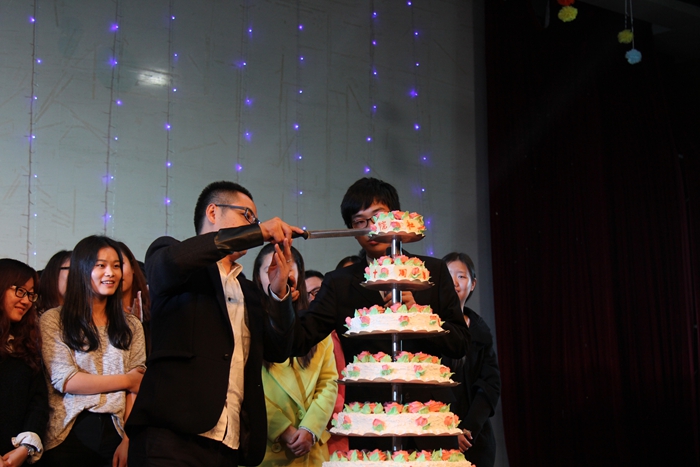 生日祝福視頻拉開了社聯(lián)10周年生日慶典的序幕,現(xiàn)場氣氛充滿溫馨與感動(dòng)。宣傳部熱辣動(dòng)感又不失俏皮的小雞舞《咕咕day》點(diǎn)燃了全場氛圍;接著,辦公室?guī)淼牡膭?chuàng)意T臺(tái)秀也不甘示弱,小清新裝扮配上《光陰的故事》優(yōu)美的旋律沖擊著觀眾的視聽神經(jīng);外聯(lián)部的舞蹈《小蘋果》動(dòng)感十足,震撼全場;監(jiān)察部《瘋狂的舞者》,激情洋溢,掌聲不斷。十年風(fēng)雨,十年沉淀,在一段深入人心的旁白過后,院社聯(lián)元老和嵇天培書記先后上臺(tái)發(fā)表感想,表達(dá)了對社聯(lián)的愛與期盼;緊接著是互動(dòng)環(huán)節(jié),不管是大胃王,還是全場搖一搖,都引得現(xiàn)場歡呼聲笑語聲此起彼伏;接著,汪洋書記的助興演唱再一次將現(xiàn)場的氣氛推向高潮;最后伴隨著財(cái)務(wù)部《相親相愛一家人》,兩位主席推出生日蛋糕,社聯(lián)十周年生日慶典在溫馨與感動(dòng)中落下帷幕。