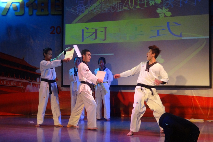 最后,閉幕式進入到聯歡環節。來自讀者協會、喜劇社、愛樂社代表共同為大家奉獻了一場歌舞紛呈、精彩萬分的表演。精武社的雙截棍、跆拳道協會表演的《跆拳道》、戲劇社的《同品三國》、愛樂社的二胡獨奏《萬馬奔騰》等精彩的表演把閉幕式聯歡推向了高潮。