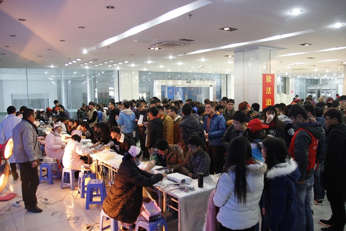 在圖文信息樓的大廳里最顯眼的就是志愿服務(wù)臺(tái)、熱水供應(yīng)臺(tái)以及周?chē)男麄靼澹驹刚邆冋χ鵀橥瑢W(xué)們解答疑問(wèn)、接熱水,他們用自己真誠(chéng)的笑臉和熱情的服務(wù)表達(dá)著對(duì)無(wú)償獻(xiàn)血同學(xué)們的敬意。在志愿者的引導(dǎo)維持下,領(lǐng)表、體檢、采血樣、獻(xiàn)血的各個(gè)流程都秩序井然,同學(xué)們的臉上都洋溢著體驗(yàn)獻(xiàn)血的興奮和真情奉獻(xiàn)的滿(mǎn)足。