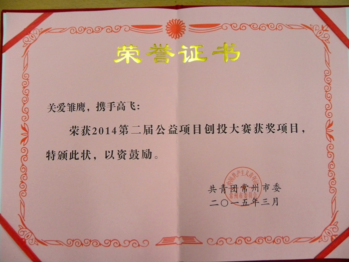 近日,從共青團常州市委傳來好消息:我院藝術設計系團委申報的關愛重點青少年、農民工子女、弱勢兒童的“關愛雛鷹,攜手高飛”項目在常州市第二屆公益項目創投大賽中榮獲獲獎項目,并獲得了3000元的“青少年事務公益項目扶持金”。