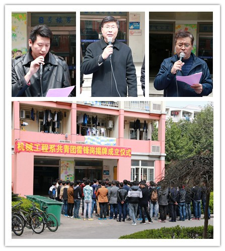 會(huì)上,學(xué)院團(tuán)委書記季華、系黨總支書記蔣志強(qiáng)共同為機(jī)械工程系共青團(tuán)雷鋒崗揭牌,系黨總支副書記孫軍向機(jī)械工程系共青團(tuán)雷鋒隊(duì)隊(duì)長閆晶同學(xué)授“機(jī)械工程系共青團(tuán)雷鋒隊(duì)隊(duì)旗”。