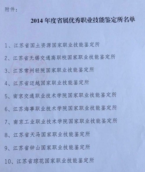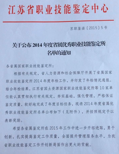 去年底,江蘇省職業技能鑒定中心根據人力資源和社會保障部以及省廳有關文件規定對全省66家省屬國家職業技能鑒定所開展了2014年度年檢工作,以資料審查和現場抽查的方式評估、審核各職業技能鑒定所的工作情況。經評審,我院排名全省第三位。本次載譽而歸是我院職業技能鑒定工作在院黨委、行政的正確領導下認真貫徹落實國家加強職業培訓促進就業政策的要求,面向全體勞動者,堅持就業導向、技能為本、質量優先三大原則,不斷加強全方位質量管理體系、多元化技能人才評價體系和先進性技術支撐體系建設,建立適應經濟發展的技能人才隊伍,促進勞動者素質就業取得明顯成效的集中展示,也是對全院各系部考評人員和技能鑒定工作人員任勞任怨、腳踏實地、勤奮工作的高度褒獎。