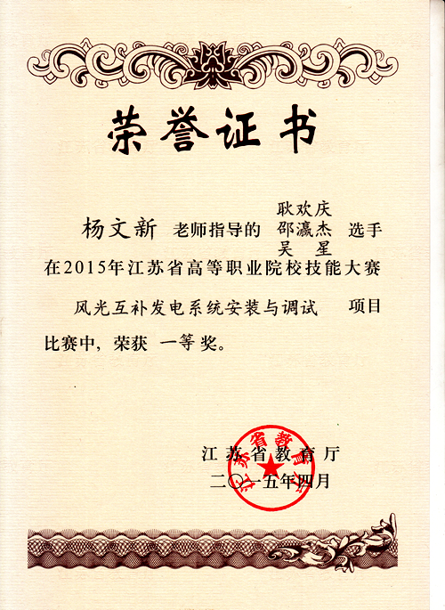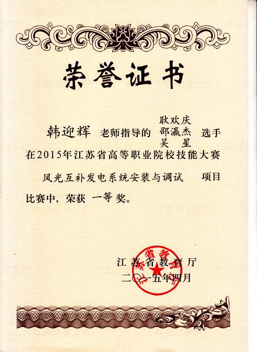 | 1 | 風光互補發電系統安裝調試 | 姚慶文 | 韓迎輝,楊文新 | 耿歡慶,邵瀛杰,吳星 | 團體一等獎 |