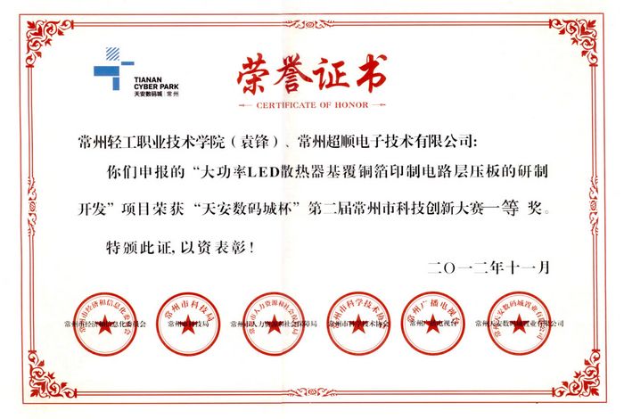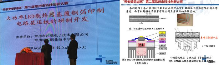 歷時近七個月的“天安數(shù)碼城杯”常州市第二屆科技創(chuàng)新大賽11月24日在市工人文化宮落下帷幕。通過項目闡述和PK辯論,我院袁鋒教授與常州超順電子技術(shù)有限公司合作的“大功率LED散熱器基覆銅箔印制電路層壓板的研制開發(fā)”的科技創(chuàng)新項目獲得了本屆科技創(chuàng)新大賽的冠軍。
