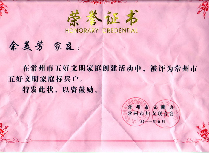 頒獎會上,學院工會主席張濤、工會副主席宗仁英到會并與余美芳老師合影。張書記對余老師家庭贍養(yǎng)老人的感人事跡表示欽佩,并代表學院師生向家庭獲得常州市文明家庭標兵稱號表示祝賀。頒獎會后,常州電視臺、常州日報、中國常州網(wǎng)、中吳網(wǎng)等相關媒體對五好文明家庭標兵事跡也進行了相關報道。