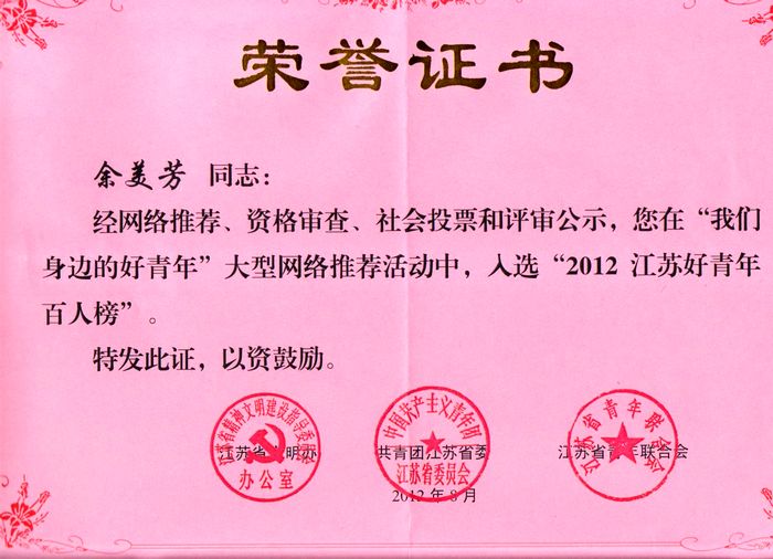 9月6日上午,2012江蘇好青年百人榜揭榜典禮在江蘇教育電視臺演播大廳隆重舉行。我院模具系余美芳老師以其“五姓之家的敬老故事”最終入選 “孝老愛親”榜,并作為好青年代表在領獎臺上講訴了自己的感人事跡。