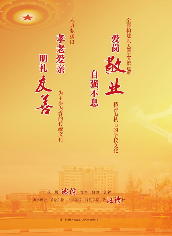 《決定》將“孝老愛親、明禮友善”的傳統文化與以鄧建軍精神為核心的學校文化相提并論:自2006年以來,我們開始全面構建以“大國工匠”鄧建軍之“愛崗敬業、自強不息”精神為核心的學校文化,取得了一系列成績。與“愛崗敬業、自強不息”八個字相對,我們用“孝老愛親、明禮友善”來概括以余美芳家庭事跡為發軔點的這另一層面文化的精髓。如果說以鄧建軍“愛崗敬業、自強不息”精神為核心的學校文化屬于我們的主流文化,那么,“孝老愛親、明禮友善”的文化,應該成為我院文化百花園中另一朵美麗之花。