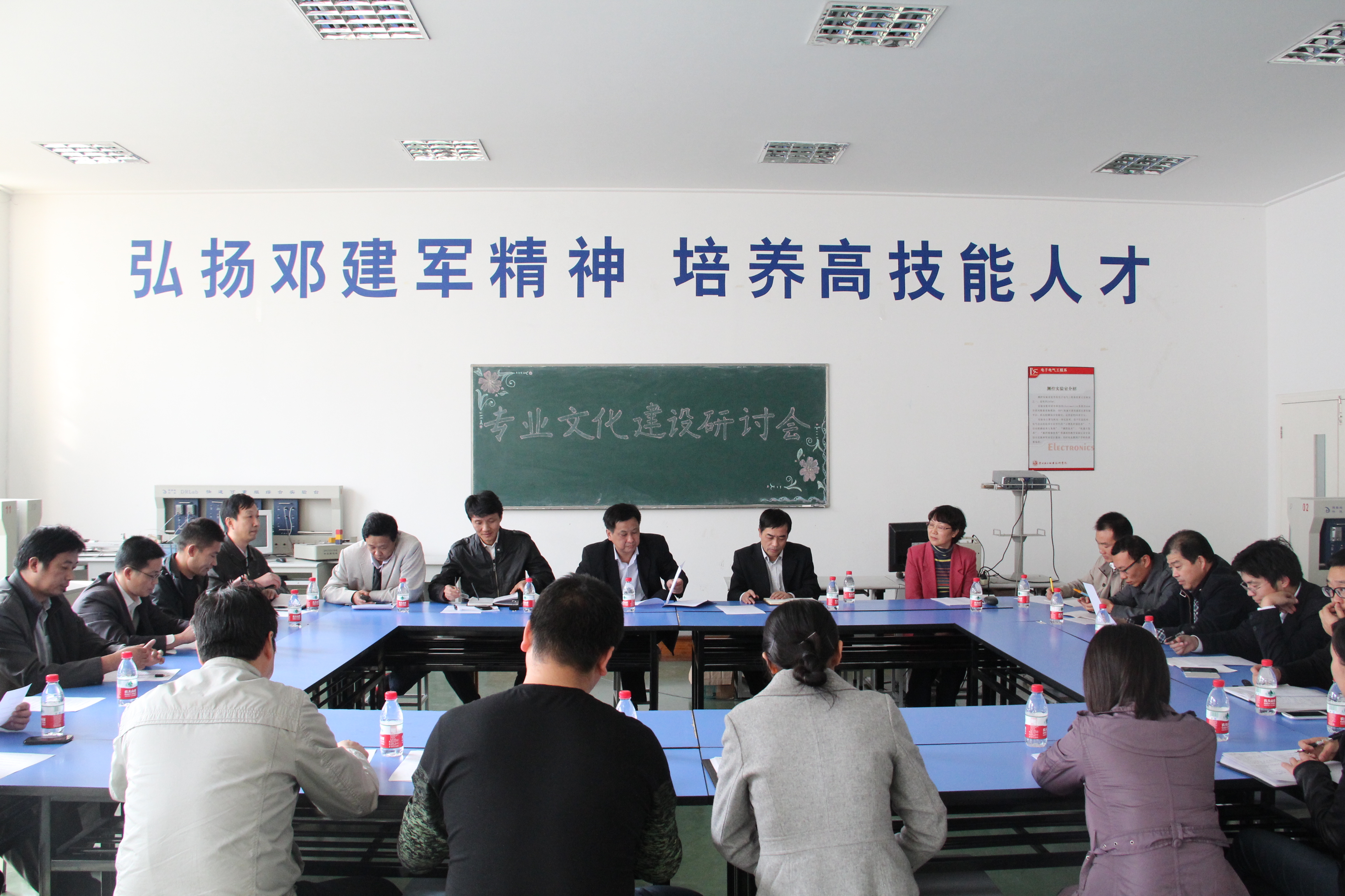 電子系專業文化建設研討會地點就安排在實訓室,周圍都是實訓訓練臺,墻上張貼者大字“弘揚鄧建軍精神,培養高技能人才”,專業文化氛圍很濃。顧留平老師發言強調了專業文化氛圍的重要性,他認為學生宿舍也應該有專業文化氛圍,應該設立專業櫥窗,建設專業社團。