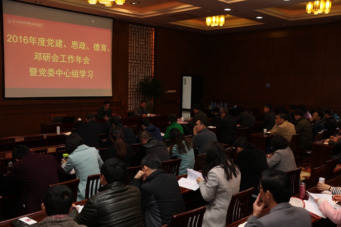 會上,院長楊勁松首先宣讀了《關于公布2016年度黨建思政德育論文評選結果的通知》。隨后,常州工學院黨委委員、機關黨委書記、黨委組織部副部長、黨委統戰部副部長熊焱生作了《四個服務:高校改革和發展新使命》的主題報告,熊部長結合學習以習近平同志為核心的黨中央治國理政新理念、新思想、新戰略和全國高校思想政治工作會議精神,從“四個偉大”:黨的十八大以來的新形勢;“四個全面”:黨的十八大以來的新任務;“四個維度”:把握習近平新時代中國特色社會主義思想和“四個服務”:高校改革和發展的新使命等角度,對十八大以來的三中、四中、五中、六中全會精神及全國高校思想政治工作會議精神進行了詳細的梳理和凝練,并結合自己的學習體會,與大家暢談了今年全國“兩會”精神中熱議的現代職業教育新目標、新任務、新要求。