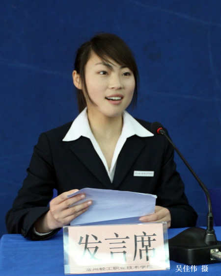 指導教師代表信息工程系王霞俊老師和參賽選手代表旅游系11酒管333班陳歡同學分別在會上發言。