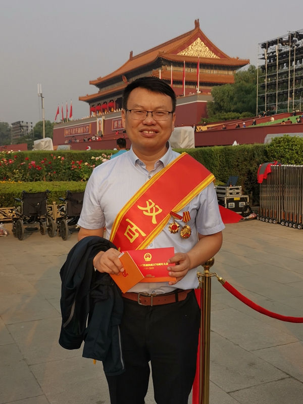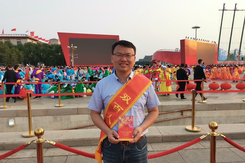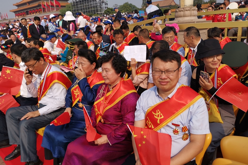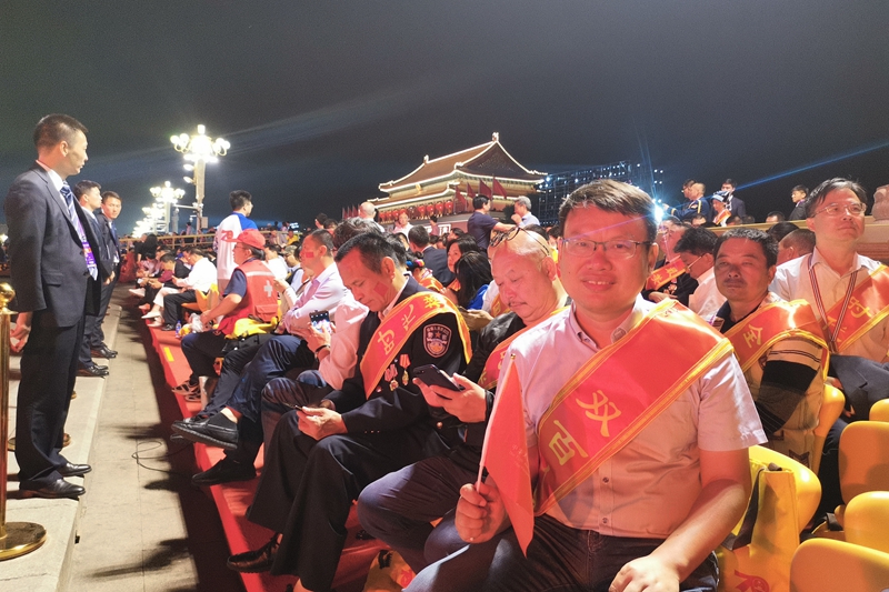 電話采訪鄧建軍,他介紹說:“我們130位被邀代表住在鐵道大廈,10月1日早晨5點多起床,6:20集合乘車去天安門廣場。我的位置在天安門城樓東南側東臨2區2排。上午10點至12點40分,我們現場觀禮了一場非常震撼與激動人心的閱兵和群眾游行活動,這是我一生中最神圣而光榮的時刻。”