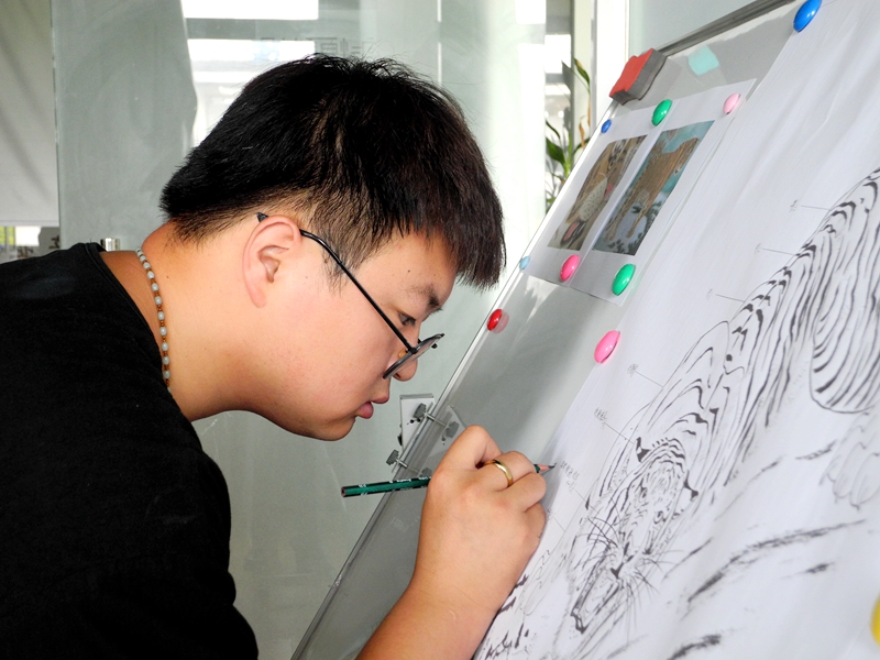 大二暑假,也是機緣巧合,媽媽讓他去陜西跟一位民間手工藝人學藝。在那里,他第一次接觸麥稈畫就完全著迷了。半個月后,雖學藝不精,但已經能做一些工藝不太復雜的畫作了。他早在12歲時就幫家里用電腦設計、制作刺繡圖案,與生俱來的繪畫功底和做精細活的潛質,讓郭暢旭感到麥稈畫應該就是帶著他沖破黑暗的那顆啟明星。
