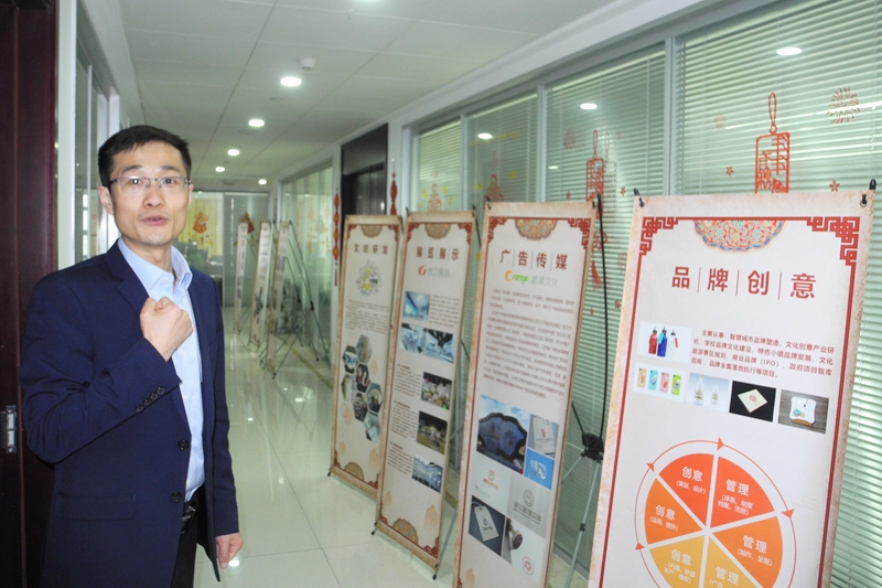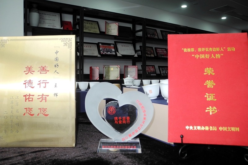 位于鐘樓區(qū)的常州科技街占地3.7平方公里,王輝的江蘇感動(dòng)未來(lái)文化科技有限公司是該區(qū)域最大的廣告文創(chuàng)公司了。公司租用了1000多平米的辦公用房,王輝帶我走進(jìn)他的406室展示廳。展示廳內(nèi)滿(mǎn)桌擺放的都是公司為客戶(hù)設(shè)計(jì)制作的陶瓷禮品,此外最霸占眼球的,就是展架上那上百幀照片和證書(shū):中國(guó)展覽工程企業(yè)一級(jí)資質(zhì)、中國(guó)廣告企業(yè)一級(jí)資質(zhì)、中國(guó)展覽館展陳工程設(shè)計(jì)施工一體化一級(jí)資質(zhì)、建筑裝修裝飾工程專(zhuān)業(yè)承包二級(jí)資質(zhì)、建筑幕墻工程專(zhuān)業(yè)承包二級(jí)資質(zhì),江蘇省創(chuàng)業(yè)典型、江蘇省廣告協(xié)會(huì)理事單位、江蘇省優(yōu)秀誠(chéng)信服務(wù)企業(yè)、常州市守合同重信用企業(yè)、常州市民營(yíng)科技企業(yè)、常州市廣告商會(huì)副會(huì)長(zhǎng)單位,常州市廣告商會(huì)秘書(shū)長(zhǎng)……讓我意外的是:展架的中央竟然出現(xiàn)了“中國(guó)好人”銅牌!