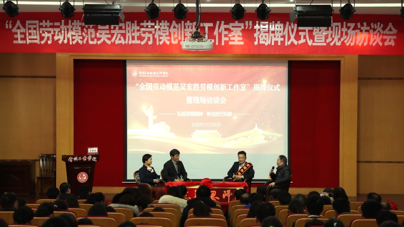 為深入貫徹落實(shí)習(xí)近平新時代中國特色社會主義思想、黨的十九大及十九大以來歷次中央全會精神,培育和踐行社會主義核心價值觀,大力弘揚(yáng)勞模精神、勞動精神和新時代工匠精神,引導(dǎo)廣大師生牢固樹立依靠勞動創(chuàng)造美好未來、托起中國夢的堅(jiān)定信念,唱響“勞動光榮、創(chuàng)造偉大”的時代主旋律,讓勞動精神和勞模工匠精神成為青年學(xué)生成長成才的精神動力,12月30日,我校舉行“全國勞動模范吳宏勝勞模創(chuàng)新工作室”揭牌儀式暨杰出校友、全國勞動模范、常州星宇車燈股份有限公司模具部部長吳宏勝現(xiàn)場訪談會。