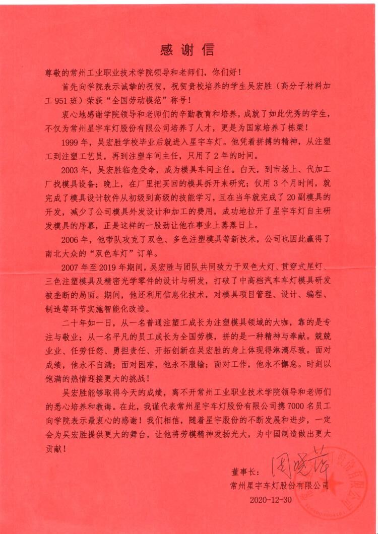 常州星宇車燈股份有限公司人力資源部部長周玥宣讀了星宇車燈公司董事長周曉萍寫給學(xué)校的感謝信,感謝學(xué)校領(lǐng)導(dǎo)和老師們對吳宏勝的悉心培養(yǎng)和教誨。