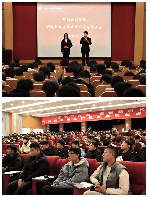 3月17日,智能控制學院在教學樓3201報告廳舉辦2019級企業訂單班首場宣講會。本次宣講會邀請了四家常州地區的行業領軍型企業參加。智能控制學院黨總支書記馮慶媛和副院長韓迎輝出席宣講會,并與企業主管就訂單式人才培養模式進行了深入交流。