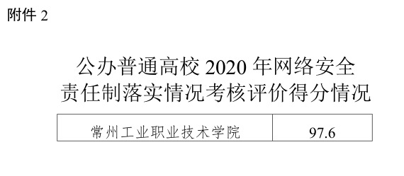 近日,省教育工委和教育廳聯合發布2020年度江蘇省教育系統黨委(黨組)網絡安全責任制落實情況考核結果,我校網絡安全黨委責任制落實情況考核評價得分97.6分,成績排名全省高職院校第二,在常高校第—,我校連續兩次獲該考核優秀。