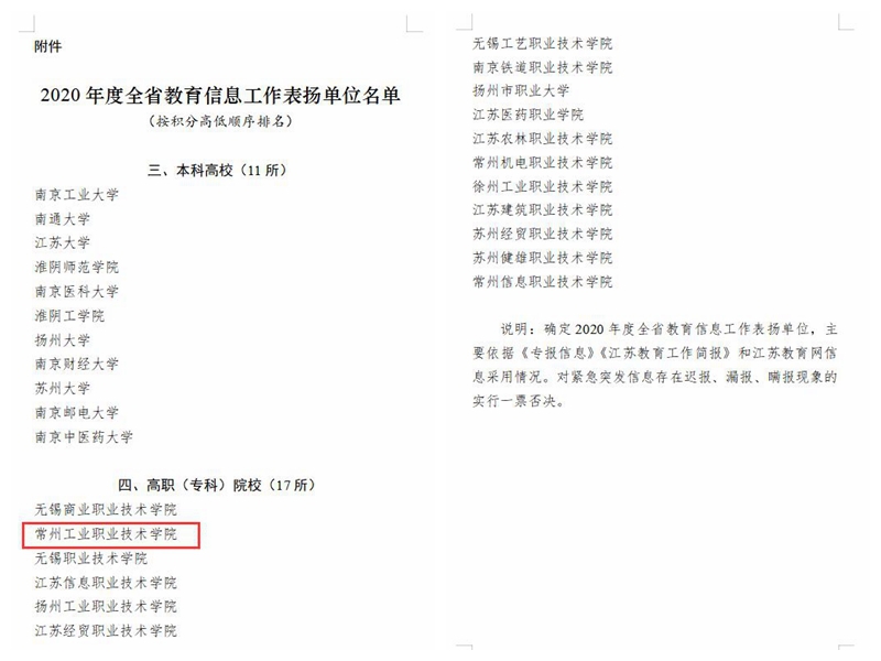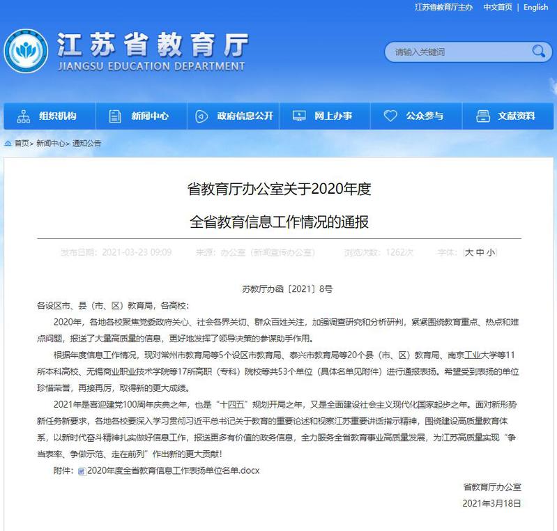 近日,江蘇省教育廳下發了《關于2020年度全省教育信息工作情況的通報》,我校在2020年度因教育信息報送工作在全省所有高校(含本科)中排名第七、在全省高職(??疲┰盒V信琶诙?,獲“全省教育信息報送工作表揚單位”稱號。
