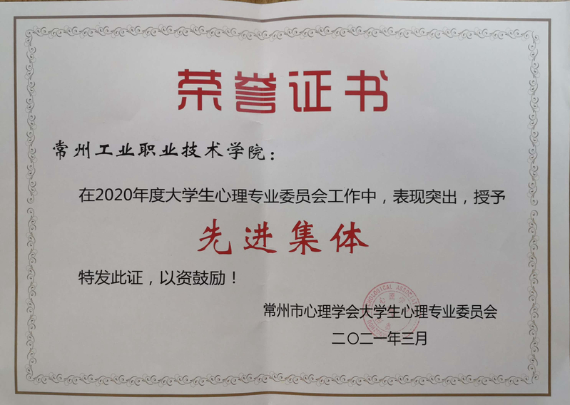 近日,在常州市心理學會開展的心理健康教育工作評比中,我校被評為2020年度心理健康教育工作先進集體,學工處心理健康教育中心主任鄭海燕被評為“心理健康教育優秀工作者”,輔導員徐創和楊璐被評為“優秀心理輔導員”,徐振勇同學被評為“優秀心理協會會員”,高文靜、孔梅英、魏淑寧同學被評為“優秀班級心理委員”。
