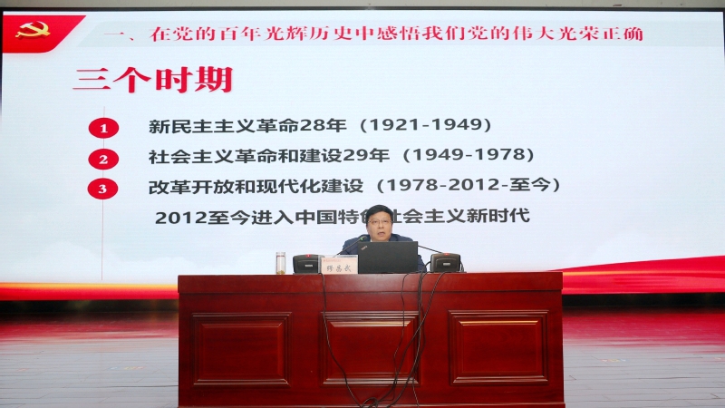 繆昌武以“不忘初心、以史為鑒、跨越百年、邁向復興,在黨的百年光輝歷史中開啟新征程”為題,剖析了新時代加強黨史教育的重要意義。他從“在黨的百年光輝歷史中感悟我們黨的偉大光榮正確”“在重溫黨的卓越成就中感悟我們黨的偉大力量”“歷史的啟示與現實的思考”“踐行初心使命、一心一意跟黨走”四個方面系統解讀了我們為什么學黨史、黨史學什么、怎樣學黨史等問題。