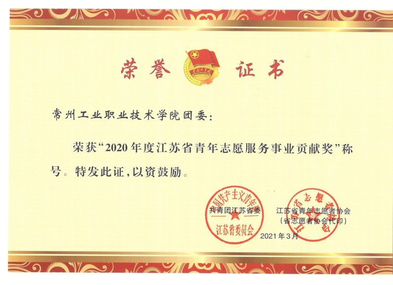 近日,共青團江蘇省委、江蘇省青年志愿者協(xié)會聯(lián)合下發(fā)《關(guān)于公布2020年度全省青年志愿者行動評選結(jié)果的通知》(團蘇委聯(lián)〔2021〕9號),我校團委榮獲“2020年度江蘇省青年志愿服務(wù)事業(yè)貢獻獎”。