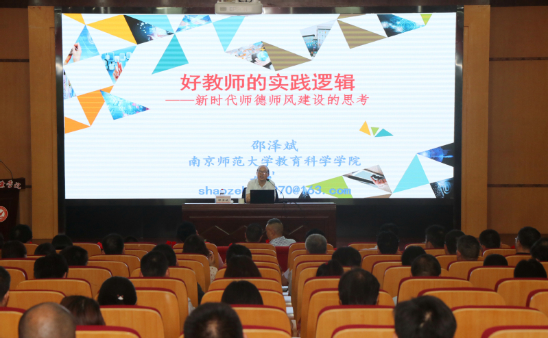 邵澤斌教授從“好老師是幸福的——何以可能”“教師失范是反邏輯的,也是邏輯的”“師德建設(shè)的路向——慷慨與節(jié)制”三個方面,以人性之視角、道德之邏輯系統(tǒng)闡述了師德師風建設(shè)的重要性,希望廣大教師要有干凈的靈魂、平和的心態(tài)、善良的人格和沸騰的生活。報告主題明確、內(nèi)容豐富、講述生動,催人奮進,使教職工進一步明確了師德是立教之本、立身之魂,只有以德修身、以德潤才,不忘初心、牢記使命,才能成為一名幸福的好老師。