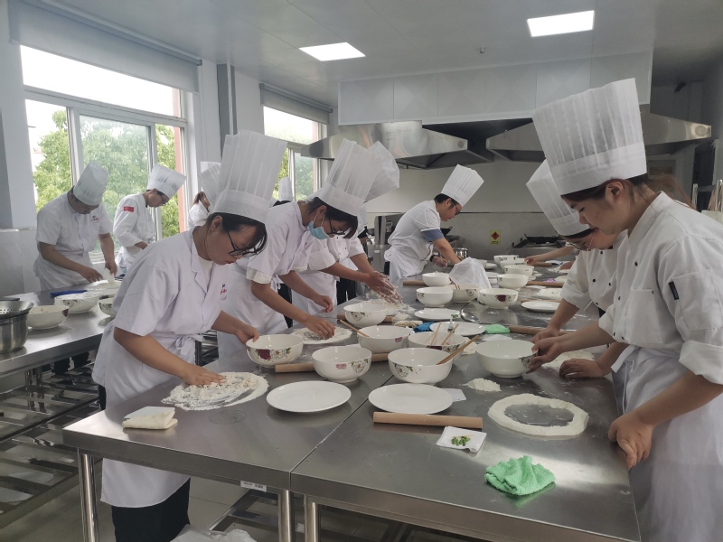 預選賽分為搟餃皮、花式蒸餃制作兩個項目,每個項目都充分考驗了參賽選手的技能水平。選手們認真備賽、精心制作,通過和面、揉面、搓條、下劑、制皮、包捏成型、蒸制成熟等工序,在規定的時間內完成了比賽。選手們制作出的“月牙蒸餃、秋葉餃、冠頂餃、四喜餃、一品餃、金魚餃”等花式蒸餃獲得了觀賽學生和老師的一致認可。