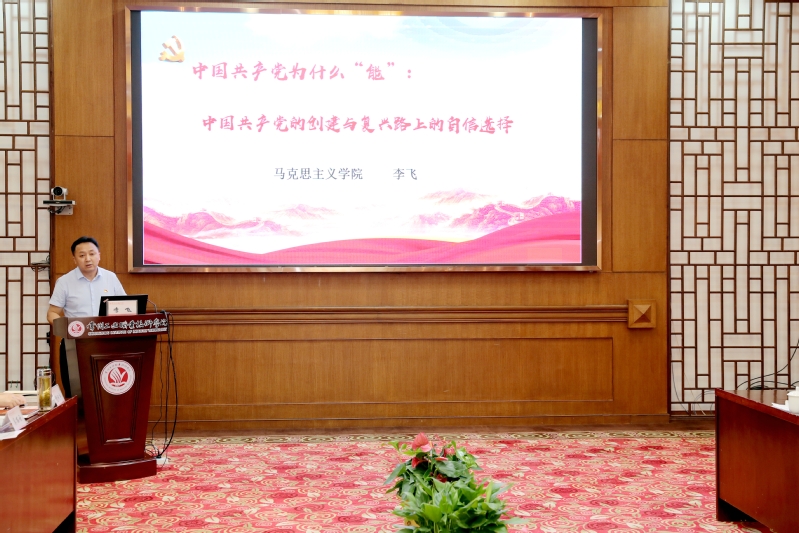 會上,與會人員觀看了馬克思主義學院張永林老師錄制的微視頻《覺醒》,此部作品運用實境拍攝、情景還原、人物專訪等藝術表現形式,生動展現了以瞿秋白、張太雷、惲代英為代表的“常州三杰”無懼困難敢于闖、著眼長遠善于創的精神稟賦。馬克思主義學院副教授李飛老師現場講授了題為《中國共產黨為什么能:中國共產黨的創建與復興路上的自信選擇》的微黨課,他從中國共產黨創建的歷史必然和民族復興面臨的挑戰與自信選擇兩個方面帶領與會人員回顧了中國共產黨帶領中國人民“站起來”、讓新中國“富起來”到開啟社會主義現代化強國的偉大征程。