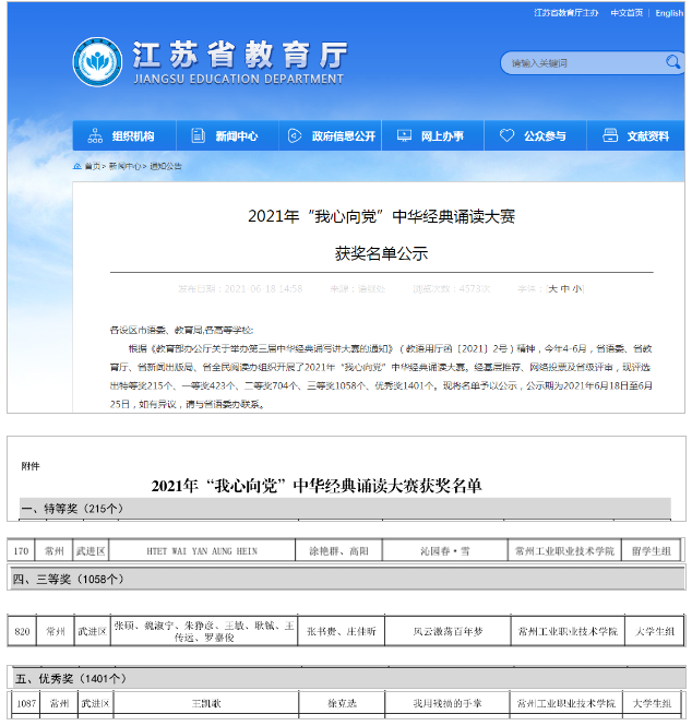 日前,在江蘇省教育廳、江蘇省語委、江蘇省新聞出版局、江蘇省全民閱讀活動(dòng)領(lǐng)導(dǎo)小組辦公室公布的2021年“我心向黨”中華經(jīng)典誦讀大賽復(fù)賽評(píng)審結(jié)果中,我校獲特等獎(jiǎng)1項(xiàng),三等獎(jiǎng)1項(xiàng),優(yōu)秀獎(jiǎng)1項(xiàng)。這是我校長期以來扎實(shí)開展語言文字宣傳工作,積極組織中華經(jīng)典誦寫講系列活動(dòng)所取得的又一項(xiàng)豐碩成果。