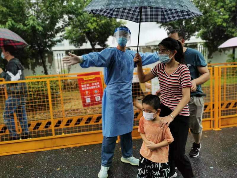 王傳遠,智能控制學(xué)院上屆學(xué)生會主席,學(xué)生黨員,家在江蘇省揚州市儀征市。因新冠病毒的再次出現(xiàn),揚州市采取緊急措施實施全市范圍內(nèi)核酸檢測。疫情之下他積極投身到疫情防控的一線為自己的家鄉(xiāng)出一份力。由于所在地區(qū)老年人居多,很多人不能夠熟練的注冊使用檢測碼登記,導(dǎo)致工作量異常繁重。長時間奮斗在一線的他并沒有因為酷暑和暴雨而打亂檢測,和現(xiàn)場的醫(yī)護人員以及志愿者們一起,首日便冒雨完成第一輪檢測,這是許多醫(yī)護人員和志愿者們雙手被汗水泡的發(fā)白,防護服內(nèi)汗水浸濕衣服換來的結(jié)果。