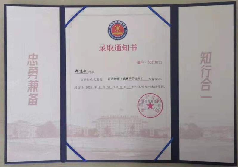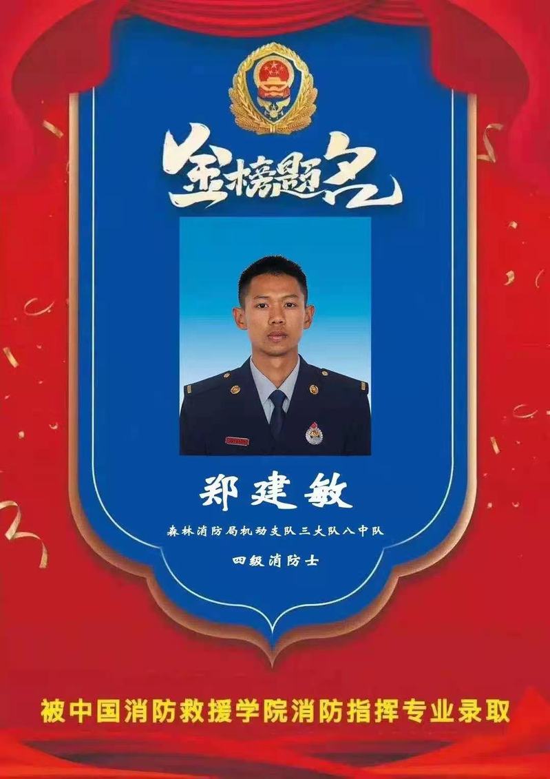 寒假期間,鄭建敏偶然得知能夠重新進入部隊的機會——國家綜合性消防救援隊伍。他深知這個機會得來不易,于是趕緊報名,在經過層層嚴格的考核后,他最終成為了一名消防指戰員。在消防隊伍中,他感受到穿了這身消防服,身上便同時肩負了使命與責任。哪里有危難,哪里就有他們。當出現抗洪,救火任務時,他永遠都沖在最前面,與洪水相伴,與火魔斗爭,永遠竭誠為民,始終把人民群眾生命財產放在第一位。當他自己經歷了這些風風雨雨,他心中的那團火更強烈了,從那時起他就默默地對自己說:“我要成為一名消防指揮員,我要將我的汗水揮灑在這項偉大的事業中。”忙碌的工作并沒有打消他繼續深造的夢想。“不想當將軍的士兵,不是好士兵。”鄭建敏一直激勵自己,白天訓練工作,晚上學習備考,他就這樣默默地堅持了一年多,最終他如愿被消防最高學府——中國消防救援學院錄取。此時的他仍然保持著一顆平常心,他深知自己為什么出發,也明白自己要走向何方,他一如既往地堅持走好每一步,毫不懈怠,不忘初心,繼續前行著。對于未來大學的規劃,鄭建敏表示,他想要拓寬自己的知識面,比如在森林搶險、自然災害搶險等方面有所涉獵和突破,發展成一名全方面人才,在應急救援事業上貢獻更多力量。