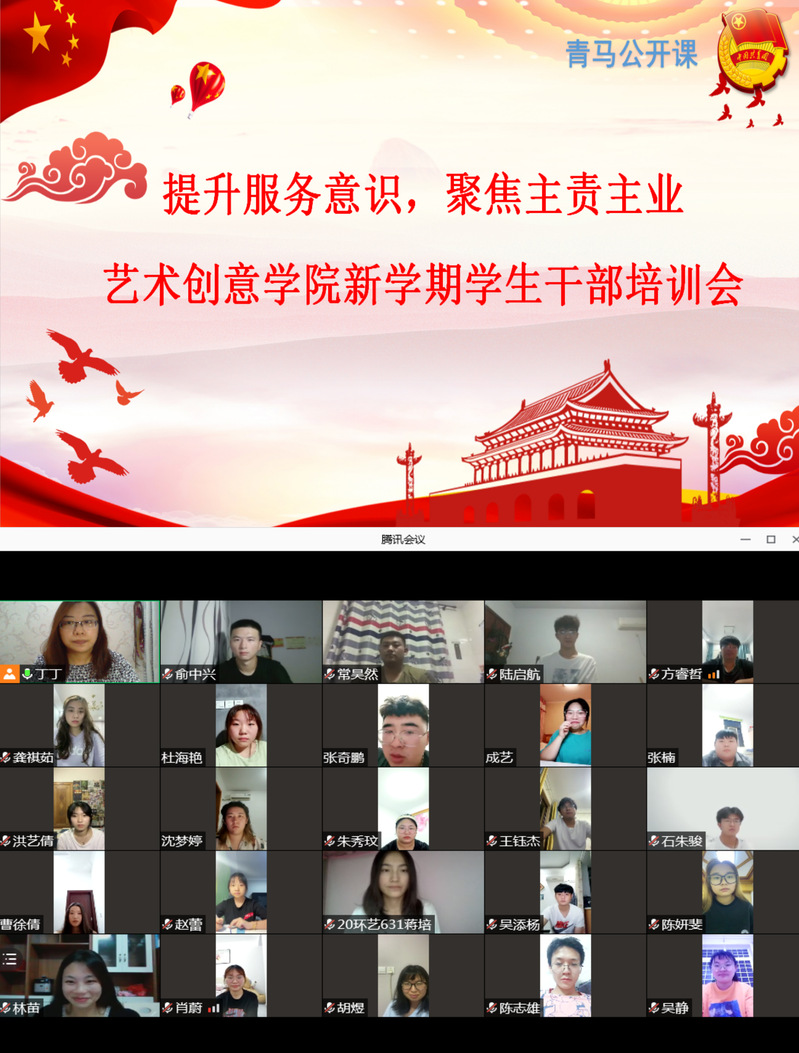 為了進一步加強學生干部隊伍建設,提升學生干部素質,切實打造一支全心全意為同學服務的學生組織,9月6日晚,藝術創意學院團委通過線上會議的方式繼續開展新學期青馬工程學生干部培訓。本次培訓會的主題為“提升服務意識,聚焦主責主業”,培訓由藝術創意學院分團委書記丁潔主講,全體學生干部參加了本次會議。