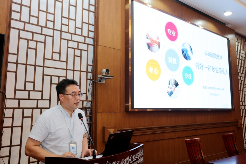 教務(wù)處處長徐偉以“科研賦能教學(xué)——做好一名專業(yè)帶頭人”為主題作專題講座。他從問題與矛盾、科研與教學(xué)、專業(yè)與專業(yè)群以及如何做好專業(yè)帶頭人這四個(gè)方面做了詳細(xì)解讀。他強(qiáng)調(diào),“十四五”時(shí)期,我們要提升高校科技創(chuàng)新水平,構(gòu)建高校科技創(chuàng)新體系,全面提升高校原始創(chuàng)新能力,推動(dòng)產(chǎn)學(xué)研用深度融合,助力國家科技自立自強(qiáng)。他指出,科教協(xié)同育人是提升高校教師科研能力和教學(xué)質(zhì)量的有效方式,是培養(yǎng)現(xiàn)代創(chuàng)新型復(fù)合型技術(shù)技能人才的必要途徑,是建設(shè)高水平高職學(xué)校和高水平專業(yè)群的必然要求。教學(xué)與科研要相融合,一是教務(wù)處和科技處信息互聯(lián)互通,聯(lián)合對(duì)科研項(xiàng)目與教學(xué)相融合的情況進(jìn)行監(jiān)督檢查;二是教師科研項(xiàng)目與畢業(yè)設(shè)計(jì)(論文)相融合,通過制度設(shè)計(jì)強(qiáng)化教師教研融合的意識(shí),指導(dǎo)學(xué)生及早確定自己的研究方向;三是科研課題與“互聯(lián)網(wǎng)+”大學(xué)生創(chuàng)新創(chuàng)業(yè)項(xiàng)目、挑戰(zhàn)杯等學(xué)科競賽相融合。此外,徐偉還探討了專業(yè)帶頭人的主要職責(zé),專業(yè)建設(shè)的基本路徑以及新進(jìn)教師、博士的個(gè)人發(fā)展路徑。