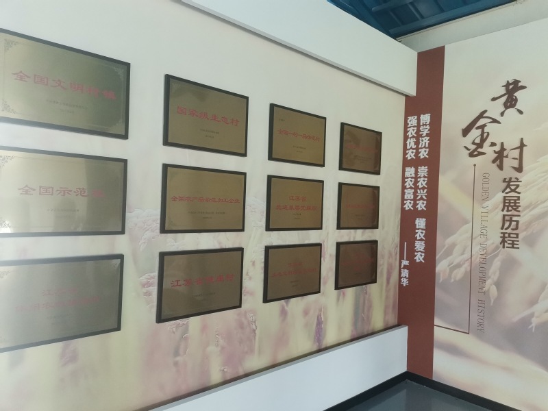 汽車駛入村里,路邊的兩層小洋房格外引人注目,房前房后種滿花草樹木,道路整潔干凈,活脫脫一幅美麗鄉村的景象。我們走進黃金村黨群服務中心,一進村支部會議室,各種榮譽牌匾和錦旗頓時映入眼簾,比如“全國文明村鎮”“全國一村一品示范村”“江蘇省生態村”“江蘇省民主法治示范村”等。座談會上,我們與黃金村黨總支成員共同觀看黃金村宣傳片,就黃金村的發展致富之路進行對話交流。