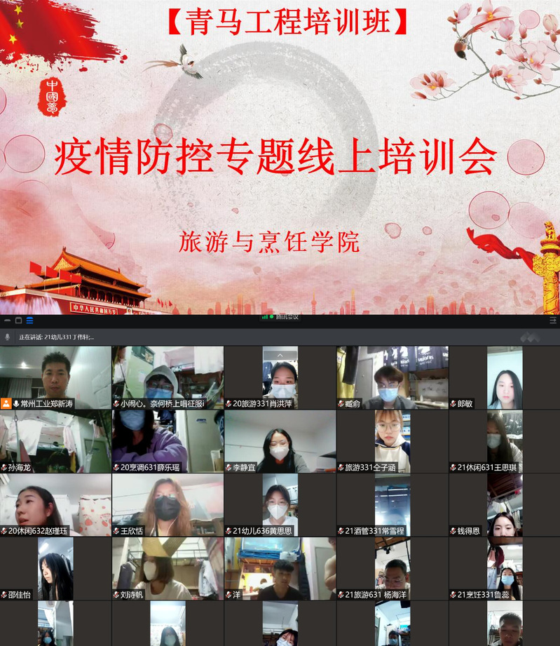 2021年11月5日晚,旅游與烹飪學(xué)院召開青馬工程培訓(xùn)班——學(xué)生干部“疫情防控”專題線上培訓(xùn)會。學(xué)院黨總支副書記郭媛、全體輔導(dǎo)員、團(tuán)學(xué)干部、各班級班委等學(xué)生干部等共計(jì)110余人參加了本次培訓(xùn)。會議由分團(tuán)委書記鄭新濤主持。