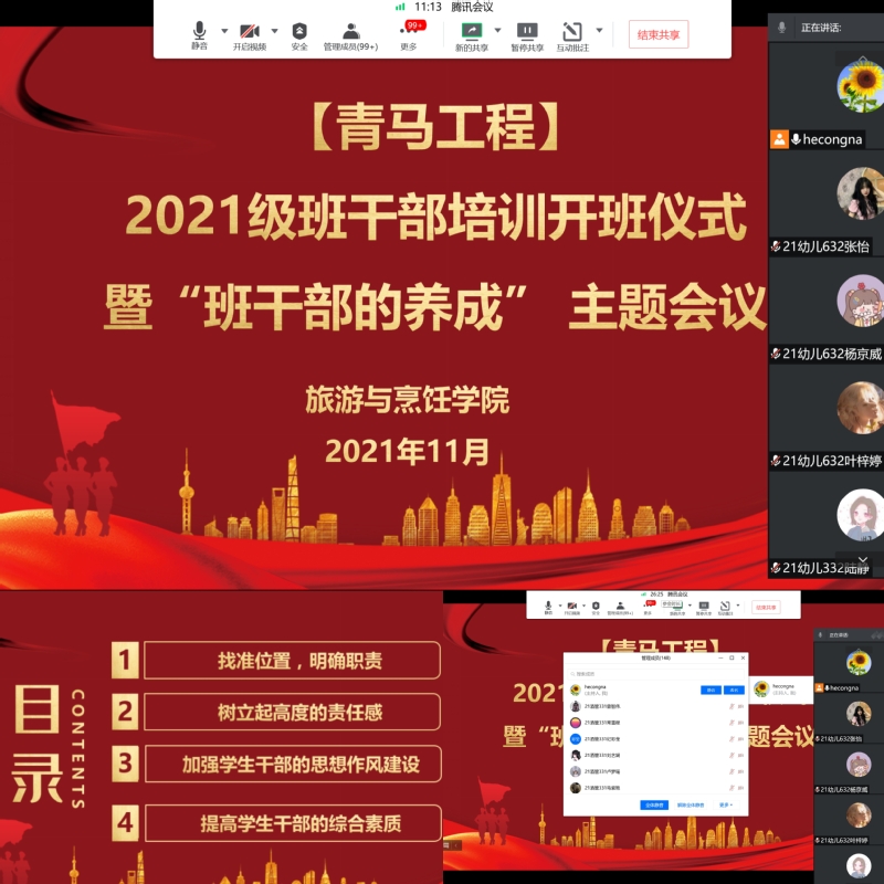 為發揚學生管理工作的優良傳統,幫助2021級新生班干部了解自身職責,提高政治素質、樹立責任感。11月10日,旅游與烹飪學院召開青馬工程培訓班——“班干部養成”線上培訓會。學院學工辦主任何從娜、輔導員王杰及全體2021級新生班干部參加會議。會議由何從娜主持。