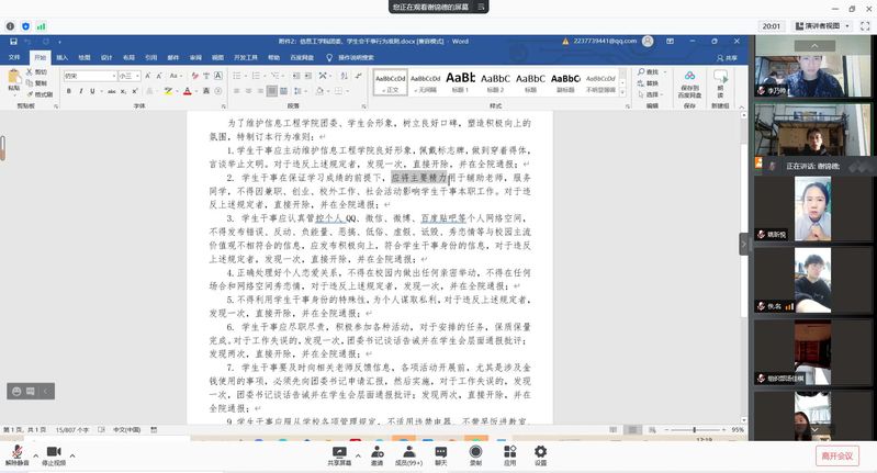 培訓(xùn)會上,學(xué)生會執(zhí)行主席謝錦德通過ppt演示的方式,從學(xué)校基本情況、團(tuán)委學(xué)生會概況、活動組織流程、文明修身等方面進(jìn)行介紹。講解過程中,他細(xì)心的對知識點進(jìn)行拓展與補(bǔ)充,分享了自己在工作方式、人際交流等方面的感悟和心得,還進(jìn)行提問互動,培訓(xùn)氣氛融洽熱烈。接著,姜婉老師就“聚焦主責(zé)主業(yè),持續(xù)深化改革,不斷加強(qiáng)和改進(jìn)高校團(tuán)學(xué)工作” 的主題,對當(dāng)前團(tuán)學(xué)改革、學(xué)生干部作風(fēng)建等方面展開講解,分析了推進(jìn)改革的必要性和重要性。她強(qiáng)調(diào),共青團(tuán)要回歸本職、學(xué)生會要回歸宗旨、學(xué)生社團(tuán)要強(qiáng)化管理,各位團(tuán)學(xué)干部應(yīng)該履行好引領(lǐng)凝聚青年、組織動員青年、聯(lián)系服務(wù)青年的職責(zé),不斷展現(xiàn)“強(qiáng)國有我”的青春風(fēng)采。本次線上專題培訓(xùn)結(jié)束后,與會團(tuán)學(xué)干部紛紛表示,在今后的學(xué)習(xí)與工作中,將嚴(yán)格按照上級要求加強(qiáng)自身建設(shè),改進(jìn)工作作風(fēng),更好的服務(wù)身邊同學(xué)。