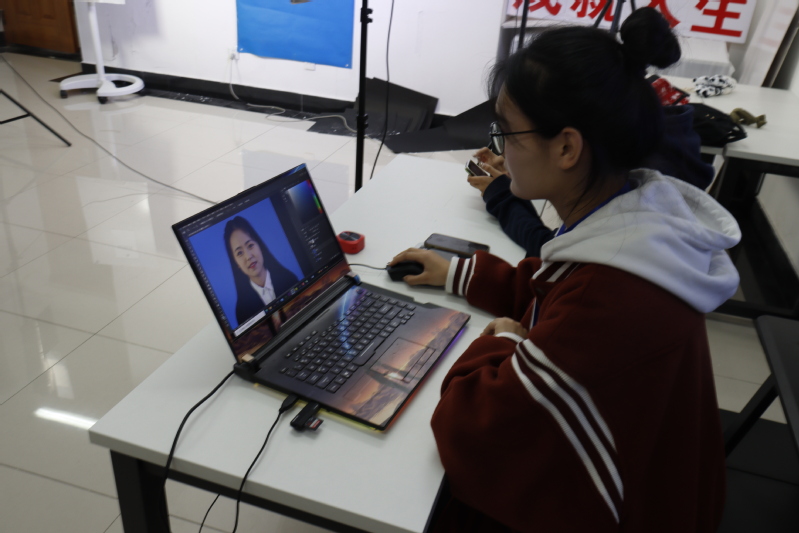 “想一想最近開心的事情,想象自己在美麗的大自然中,身體放松,保持微笑,準備,3、2、1······”聚光燈下,攝影師用鏡頭定格每位學子燦爛的笑容、自信灑脫的身姿。負責后期制作的工作人員則根據同學們的需求對每張照片進行精修,將電子版發送到同學預留的郵箱中,高效地完成了本次拍攝活動。