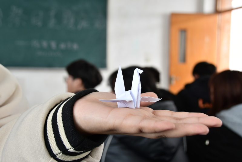 “祈愿和平”千紙鶴折紙活動。歷史不會因為時代變遷而改變,事實不會因為抵賴而消失。活動 組織同學(xué)們精心折疊出千紙鶴,并在紙鶴上用心寫上“祭奠同胞 吾輩自強”等莊嚴誓詞,寄托對南京大屠殺遇難同胞的哀思。紙鶴傳情,悼念三十萬遇難同胞;誓詞鏗鏘,吶喊八十多年血淚歷史。