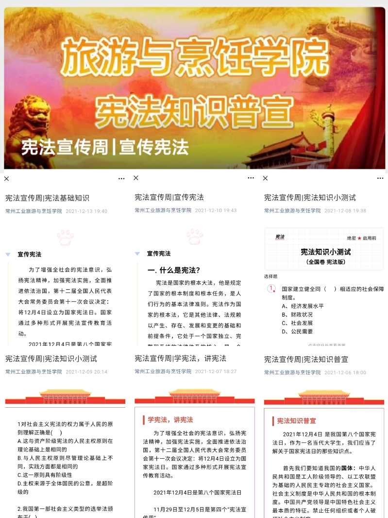 為提高學生憲法意識,維護憲法權威,普及法律知識,12月6日至12日,旅游與烹飪學院開展“憲法宣傳周”活動。輔導員王杰確立憲法宣傳內容,學生會成員設計宣傳方式,全體同學參與憲法閱讀和憲法答題。