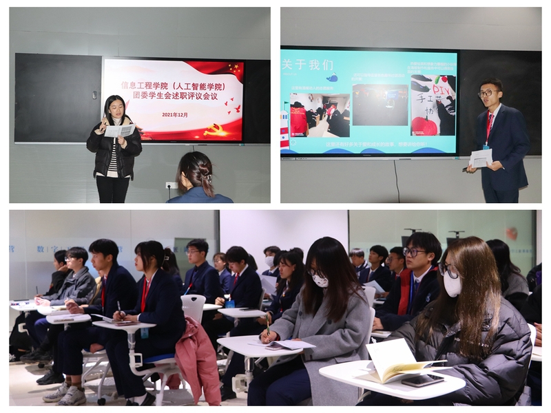 為進(jìn)一步貫徹落實(shí)十九屆六中全會(huì)精神和黨的群團(tuán)工作會(huì)議精神,結(jié)合黨史學(xué)習(xí)教育,持續(xù)深化共青團(tuán)改革,提高對(duì)學(xué)生干部的規(guī)范、科學(xué)管理,增強(qiáng)團(tuán)委學(xué)生會(huì)工作的透明度,進(jìn)一步做好信息工程學(xué)院團(tuán)學(xué)工作全面總結(jié),12月24日,信息工程學(xué)院團(tuán)委成功召開(kāi)了2021年度學(xué)生干部述職評(píng)議暨2022年團(tuán)學(xué)工作動(dòng)員大會(huì)。信息工程學(xué)院分團(tuán)委書(shū)記姜婉及信息工程學(xué)院團(tuán)委學(xué)生會(huì)全體成員參加會(huì)議。