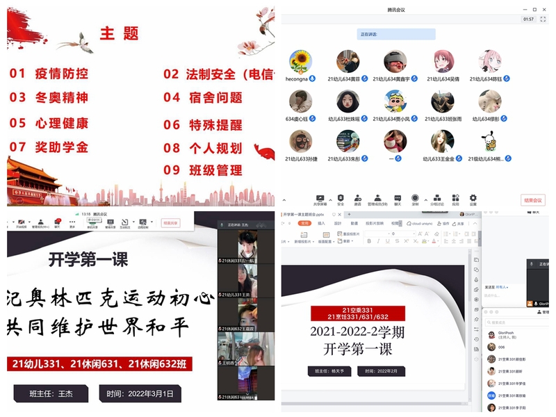 本次線上開學第一課運用教學互動的模式,生動形象地為同學們講述冬奧知識,分享“奧林匹克精神”。一是把新時代奧林匹克精神和更快、更高、更強、更團結的體育精神講深講好,引導廣大學生勇爭一流、不言放棄、奮勇拼搏。二是把冬奧會閃耀的中國元素、中國自信、中國精彩講深講好,切實增強大學生的文化自信心和民族自豪感。三是把冬奧會“更團結,向未來”的人類命運共同體這一全球價值觀講深講好,結合當今國際形勢,在大學生心中播撒和平的種子,用更開放、更包容、更自信的姿態(tài)放眼世界、開創(chuàng)未來。開學第一課還結合當前疫情防控、法治安全、心理健康、獎助學金、宿舍管理等相關問題,細致講解了關于學生學習生活的方方面面,旨在培養(yǎng)在校大學生積極健康向上的學習、生活態(tài)度,帶領廣大學生描繪新學期的憧憬,把握新的展望、新的目標,共同“扣好人生第一粒扣子”。