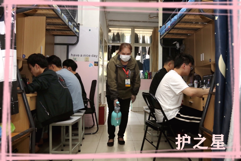 “阿姨”這個稱呼,在校園一向都象征著公寓門前的她們。檢查宿舍衛生,保證學生安全就寢,督促同學們佩戴口罩,不間斷地清潔、消殺……好像阿姨不再是“阿姨”,更像是每棟學生公寓里孩子們的母親。細心呵護,貼心照料,看見她們的笑臉便倍感安心。她們是校園里的一顆顆“護之星”。