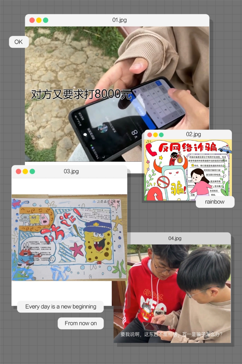 “藝”起反詐。活動中,許多同學以生動趣味的海報、手抄報,將常見的詐騙方式呈現在大家面前,同時,還有不少同學組織拍攝了校園詐騙系列微視頻,并在線上進行公開發表,吸引了大批圍觀與點贊。