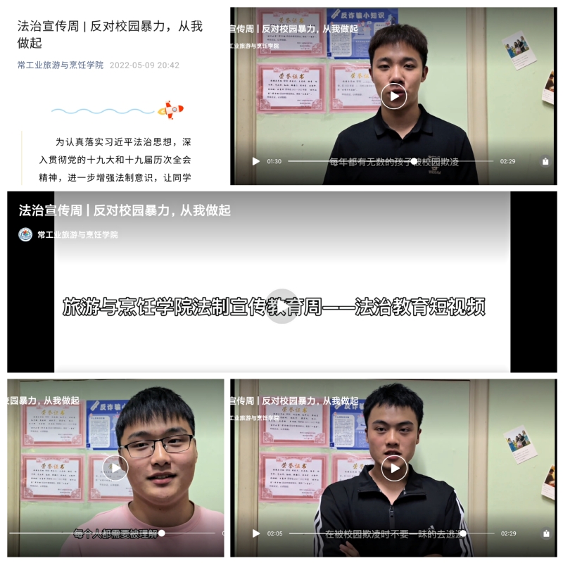 以杜絕校園暴力為主題,開展法治故事短視頻拍攝活動。5月9日,為進一步提高同學們的法治意識,夯實法律基礎知識,傳播法治文化,認清法律重要性,我院組織開展了普法宣傳視頻拍攝活動——《反對校園暴力,從我做起》。視頻拍攝以日常生活中常見的幾種校園暴力類型為主,同學們結合網上真實案例,自編自演,生動地演繹了校園暴力可能給同學們帶來的危害,并在視頻最后呼吁所有人抵制校園暴力,鼓勵曾被校園暴力或正在經受校園暴力的同學敢于拿起法律武器保護自己的人身安全和合法權益。此次活動意義深遠,將最常見的校園違法行為用直觀的方式演繹出來,有效宣傳法律知識,普及法律常識。