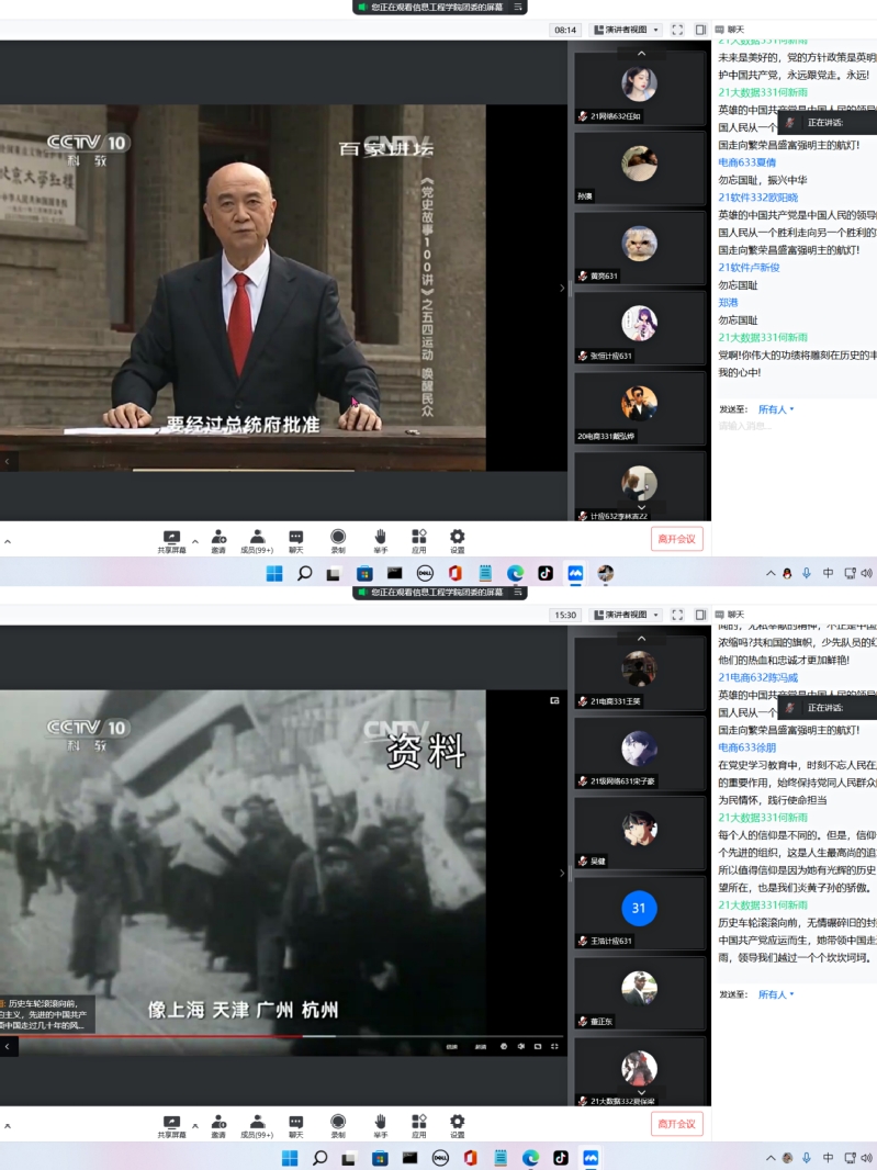 線上紅色觀影。為深入貫徹“我們一起學黨史”活動,傳承紅色基因,信息工程學院舉辦線上紅色觀影活動,全體信息工程學院學生參與觀看。活動播放了“我心中的革命人物”活動中的優秀作品,觀看了《黨史故事100講》系列視頻,參加觀影活動的同學在線上也展開了熱烈的討論,此次活動不僅使同學們重溫了五四運動那段崢嶸歲月,感受到了革命先輩的信仰和他們為理想而執著努力奮斗的紅色精神,還讓大家受到了一次深刻的愛黨愛國主義教育,21大數據331的何新宇同學表示,這次紅色觀影活動,是一次非常深刻的黨史學習教育,是一次難得自我提升、自我升華的經歷。