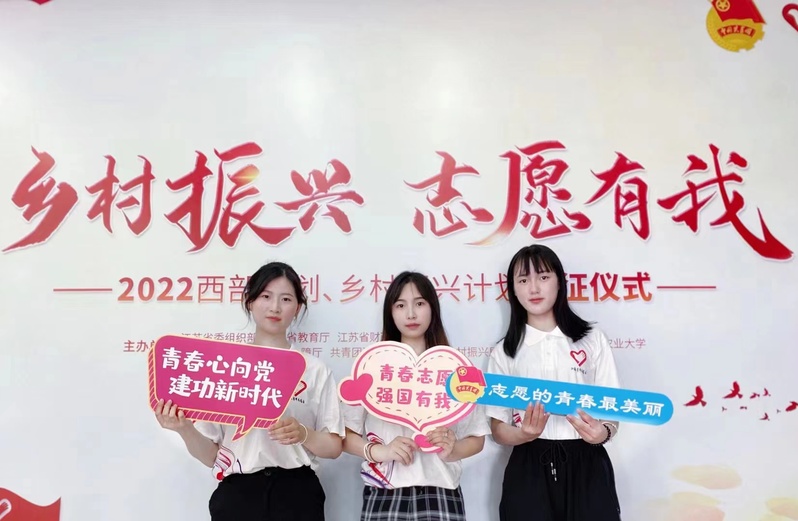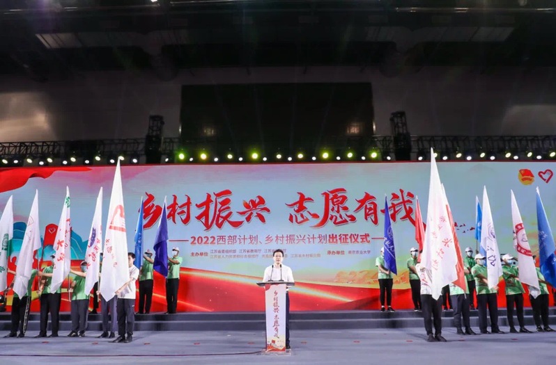 近日,2022年江蘇大學生志愿服務“西部計劃”“鄉村振興計劃”出征儀式在南京農業大學體育館舉行,歡送全省162所高校的2839名大學生志愿者到西部和鄉村振興一線,開展為期1至3年的志愿服務,我校王暢、朱瑩瑩、韋立力同學作為志愿者代表參加出征儀式。